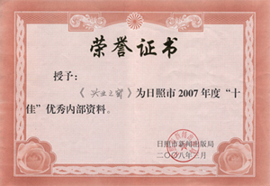 ·2007年,《興業(yè)之窗》被日照市新聞出版局評為日照市十佳優(yōu)秀內(nèi)部資料
