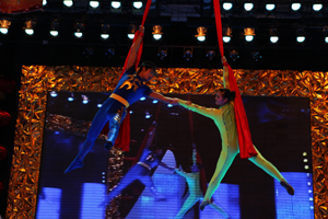 整場晚會以興業(yè)集團(tuán)成立10周年走過的光輝歲月為主線,在興發(fā)公司選送的歌伴舞《吉祥頌》中拉開了帷幕,伴隨著激越的鼓點(diǎn)、歡快的舞蹈、喜悅的歌聲,霎時(shí),千米演播大廳成為了歡樂的海洋。興業(yè)房產(chǎn)公司選送的歌舞《紅旗飄飄》、《愚公移山》,唱出了興業(yè)人對偉大祖國的熱愛和百折不撓的創(chuàng)業(yè)精神;興業(yè)汽配公司選送的《前門情思大碗茶》京味十足,集團(tuán)機(jī)關(guān)選送的原生態(tài)陜北民歌《山丹丹花開紅艷艷》和青春奔放的流行歌曲《改變自己》,展現(xiàn)了興業(yè)人多才多藝的時(shí)代風(fēng)采;天泰鋼構(gòu)公司田雯雯一曲《美麗心情》抒發(fā)了興業(yè)人對美好生活的熱愛和追求;房產(chǎn)公司姑娘們表演的富有濃郁民族特色的新疆舞《西域風(fēng)情》,勾起觀眾對邊疆風(fēng)情的片片遐想。集團(tuán)機(jī)關(guān)創(chuàng)作的配樂詩朗誦《興業(yè)十年頌》和音樂群口快板《說唱興業(yè)房產(chǎn)》,讓全場觀眾打開記憶之門,重溫了興業(yè)集團(tuán)10年的發(fā)展歷程,更是喚醒了興業(yè)人強(qiáng)烈的歷史使命感和自豪感,迸發(fā)出一股強(qiáng)大的自我升華的豪邁激情。青島永杰的姑娘們帶來的《激情水鼓》,奏響迎春盛典,震耳欲聾的鼓聲配合激昂的音樂,水花飛濺,光芒四射,引爆全場激情。友誼商店的姑娘們表演的運(yùn)動(dòng)時(shí)裝秀和社區(qū)老年人表演的太極功夫扇《夕陽美》,活力十足的青春魅力與剛?cè)岵?jì)的白發(fā)矍鑠,演繹出了一幅興業(yè)大家庭的和諧美景。公司選送的小品《風(fēng)波》和興發(fā)公司選送的山東快書《大老郭趕春晚》,情趣交融,令人捧腹,反映出了當(dāng)代建筑工人的情感世界和興業(yè)人對企業(yè)的無限熱愛之情。雜技《夢幻藍(lán)綢》驚險(xiǎn)刺激,動(dòng)人心魄,引起場下觀眾陣陣驚呼。當(dāng)全場觀眾期待已久的北京《OOB美少女組合驚艷亮相時(shí),場下掌聲雷動(dòng),歡呼一片,動(dòng)感十足的青春美少女用她們的成名作《地球媽媽》和一首《心想事成》,甜歌勁舞,征服了全場觀眾,再掀晚會新高潮!吧揭粯拥臍馄,海一樣的魂,春天里走來了興業(yè)人”,伴隨著晚會主題歌曲《興業(yè)春天》的響起,《興業(yè)春天》興業(yè)集團(tuán)2010年春節(jié)聯(lián)歡晚會華彩落幕。